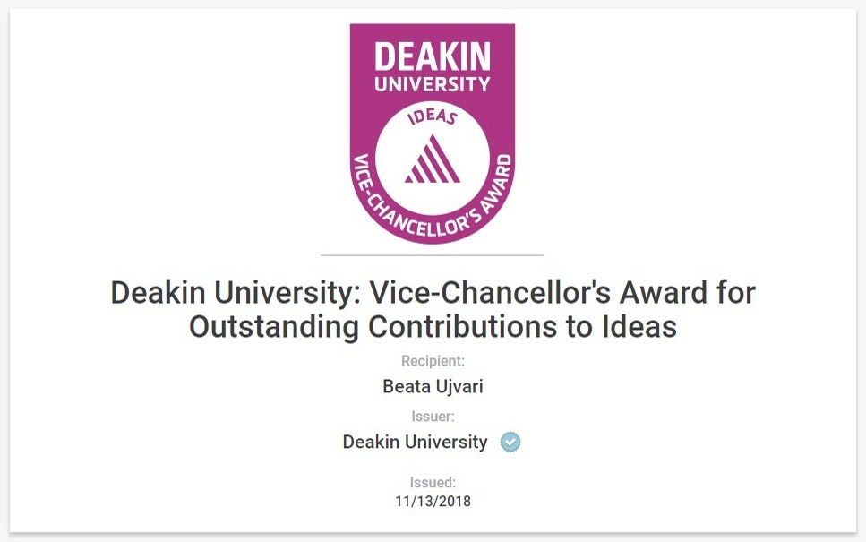 The Deakin University Vice-Chancellor’s Awards for Outstanding Contributions to Ideas recognise and celebrate outstanding contributions to research made by staff encapsulating and implementing the IDEAS pillar of Deakin’s strategic agenda, LIVE the future, to ‘make a difference through world-class innovation and research.’