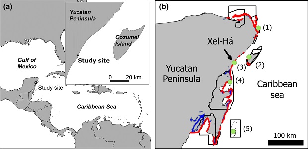 Location: The inlet of Xel‐Há, typical of groundwater‐fed coastal areas widely distributed along the Yucatan Peninsula coast in Mexico and partially protected by a network of marine protected areas.