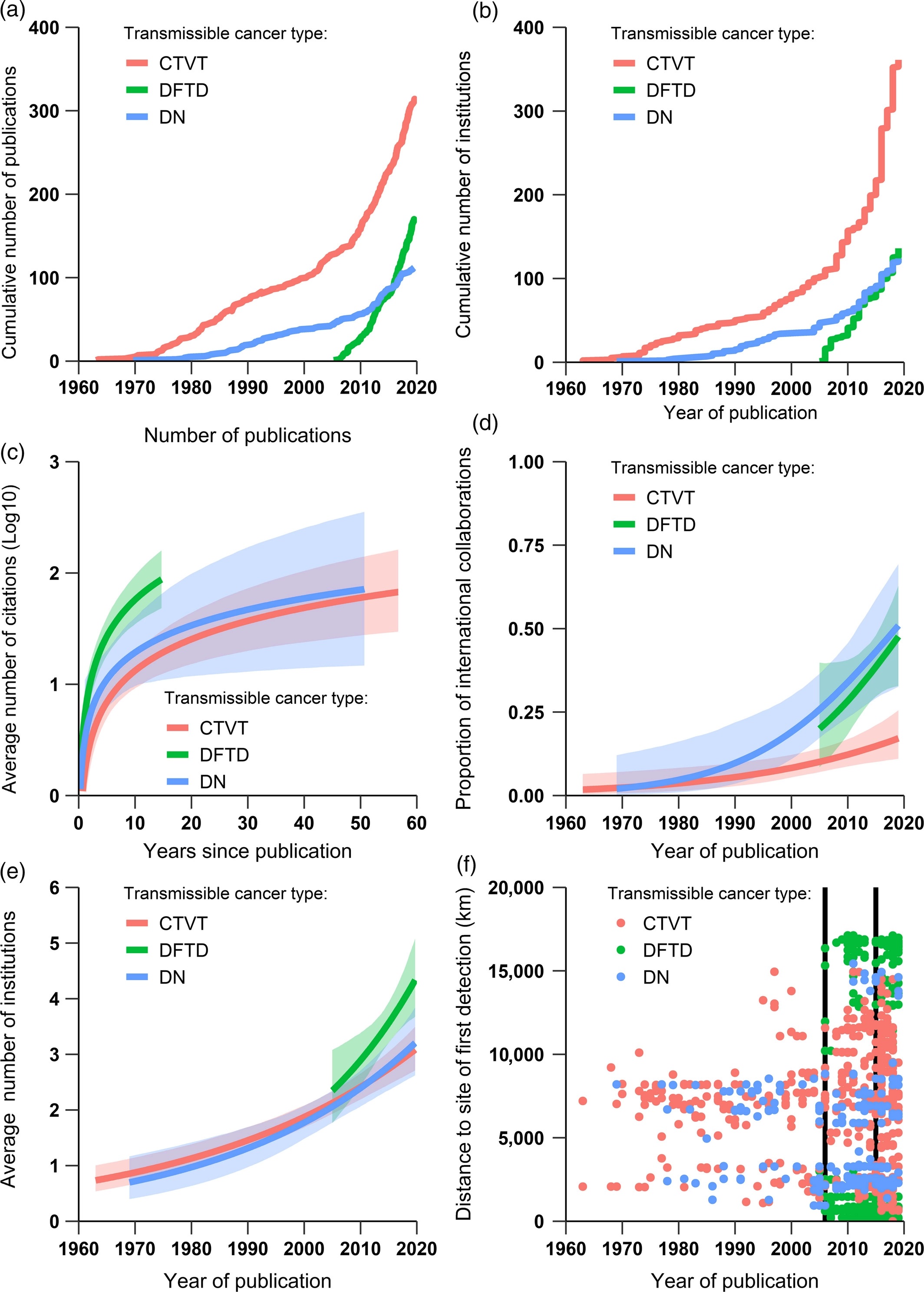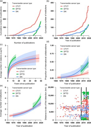 Here, we quantify how collaborative effort on the three known transmissible cancers has advanced through the formation of collaborative networks among institutions and disciplines. These three cancers occur in bivalves (invertebrates—disseminated neoplasia; DN), Tasmanian devils (vertebrate—marsupial; devil facial tumour disease; DFTD) and dogs (vertebrate—eutherian mammal; canine transmissible venereal tumour; CTVT). Research on CTVT and DN has been conducted since 1876 and 1969, respectively, whereas systematic research on DFTD only started in 2006.