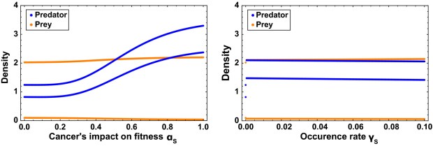 First, we demonstrate a clear difference between prey and predator vulnerability to cancer, with cancer having a limited impact on prey populations. Second, we show that biotic interactions can surprisingly lead to a null or positive effect of cancer on population densities.
