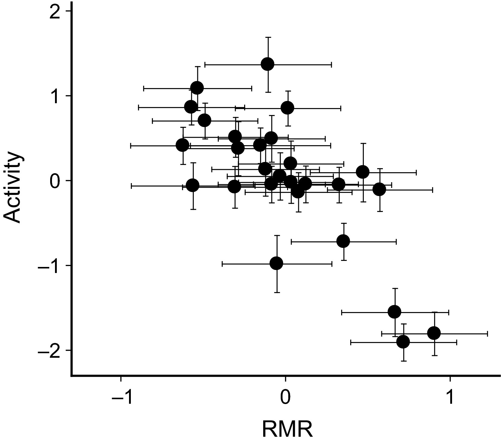Predicted mean values for individual activity rate and resting metabolic rate (RMR), and associated SE’s for each, as extracted from the bivariate mixed‐effects model. Values are expressed as deviations from the mean level model and are in units of standard deviations due to data standardization to mean zero and SD = 1. The overall average mass‐corrected RMR was 184 mg O2/g/h (range = 138–240 among individuals)