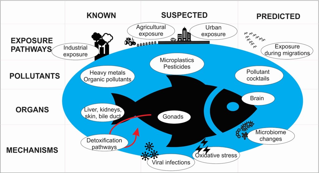 For the first aim, we use available knowledge from aquatic species to suggest physiological mechanisms that link pollution and cancer, including main metabolic detoxification pathways, oxidative damage effects, infections, and changes to the microbiome.