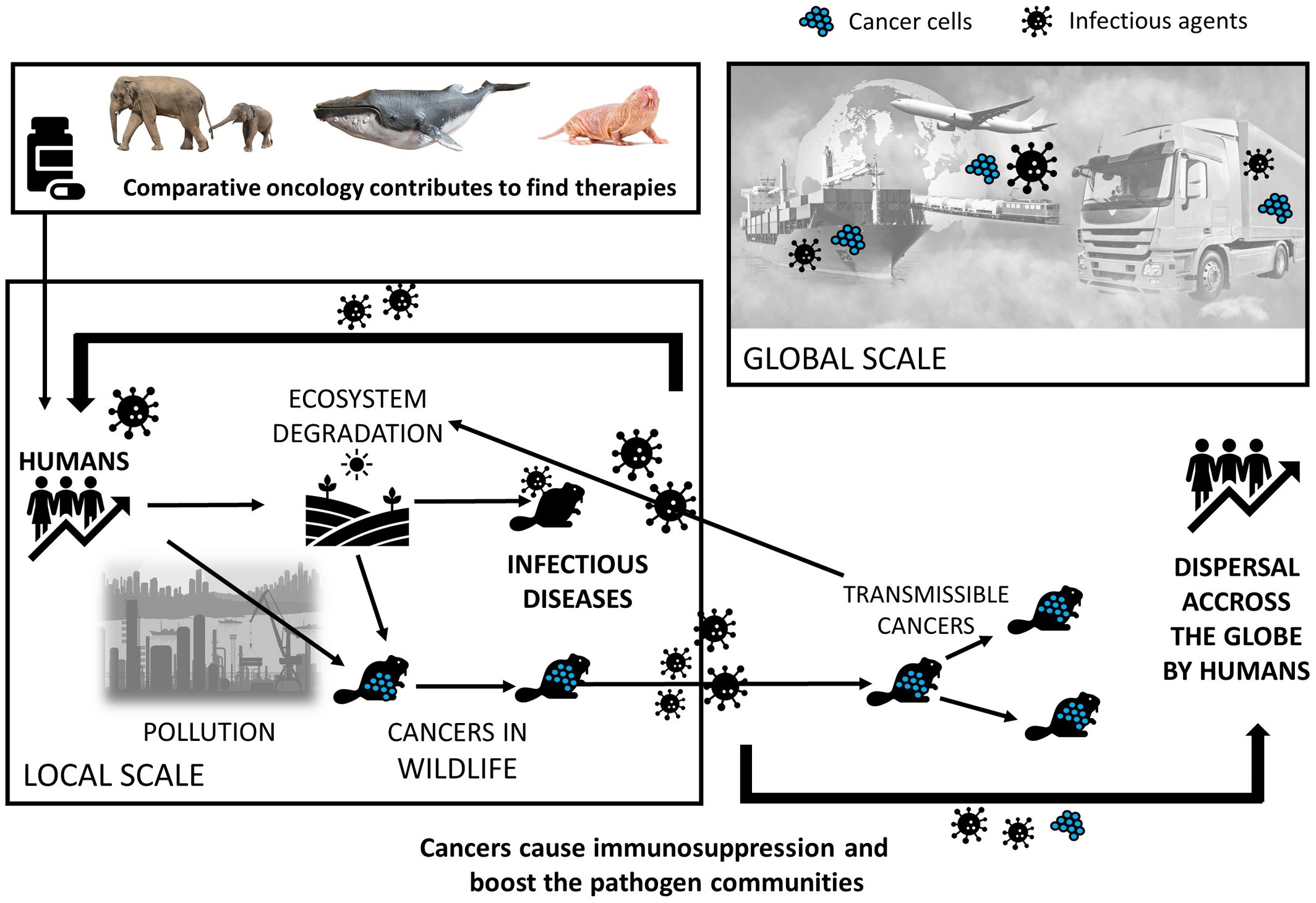 First, human activities are oncogenic to other animals, exacerbating the dynamics of oncogenesis, causing immunosuppressive disorders in wildlife with effects on host–pathogen interactions, and eventually facilitating pathogen spillovers.
