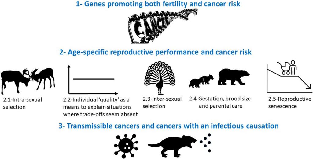 Here, we review the diverse ways in which age-specific reproductive performance (e.g., reproductive aging patterns) and cancer risks throughout the life course may be linked via trade-offs or other mechanisms, as well as discuss situations where trade-offs may not exist.