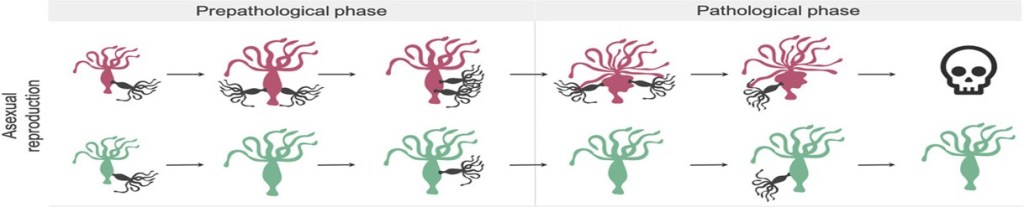 We found that tumorous polyps have a reduced survival compared to healthy ones. However, they also displayed higher asexual reproductive effort, by producing more often multiple buds than healthy ones. A similar acceleration is observed for the sexual reproduction (estimated through gamete production). Because tumoral cells are not transmitted through this reproductive mode, this finding suggests that hosts may adaptively respond to tumors, compensating the expected fitness losses by increasing their immediate reproductive effort.