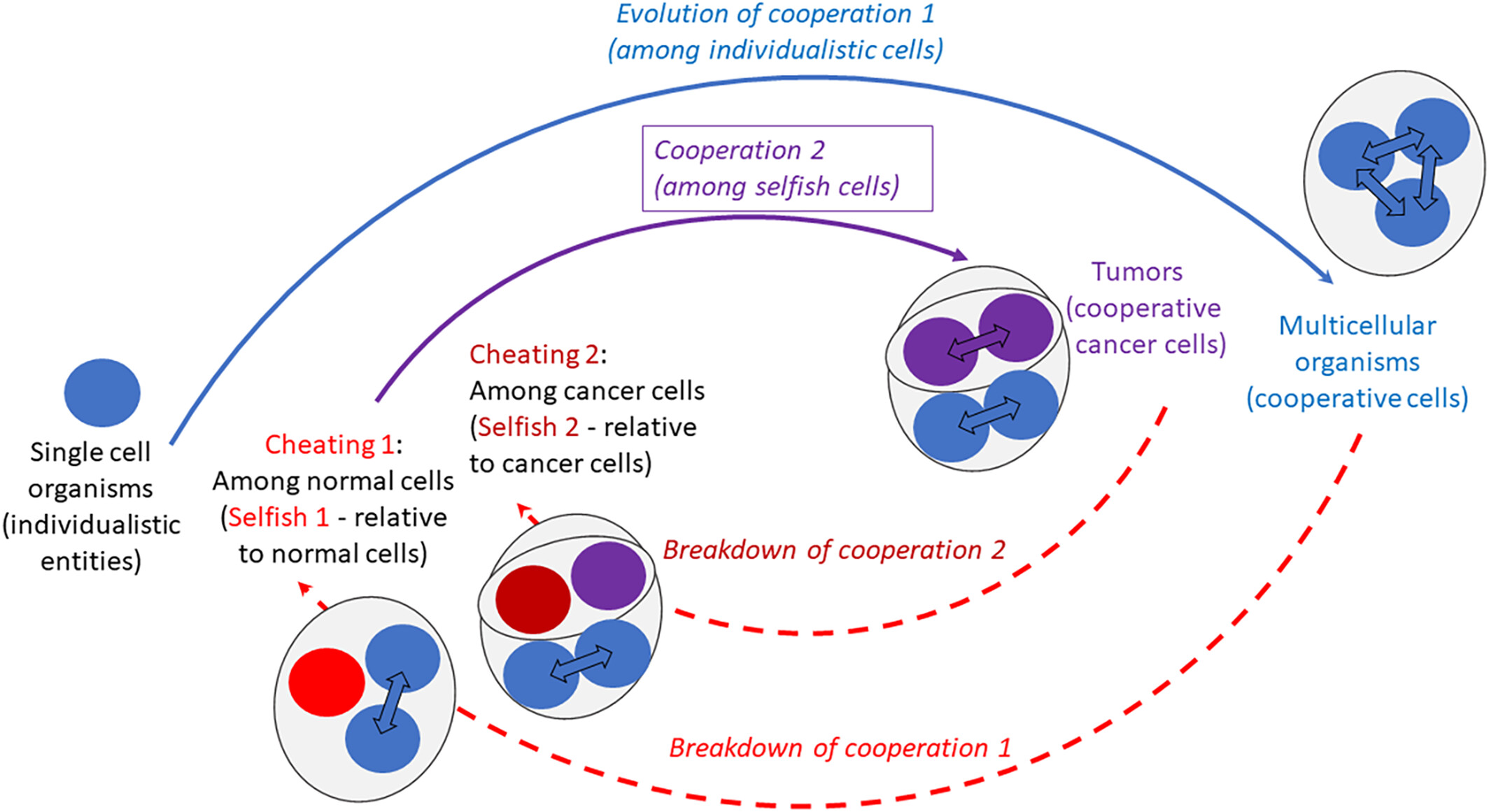 It is traditionally assumed that during cancer development, tumor cells abort their initially cooperative behavior (i.e., cheat) in favor of evolutionary strategies designed solely to enhance their own fitness (i.e., a “selfish” life style) at the expense of that of the multicellular organism. However, the growth and progress of solid tumors can also involve cooperation among these presumed selfish cells (which, by definition, should be noncooperative) and with stromal cells.