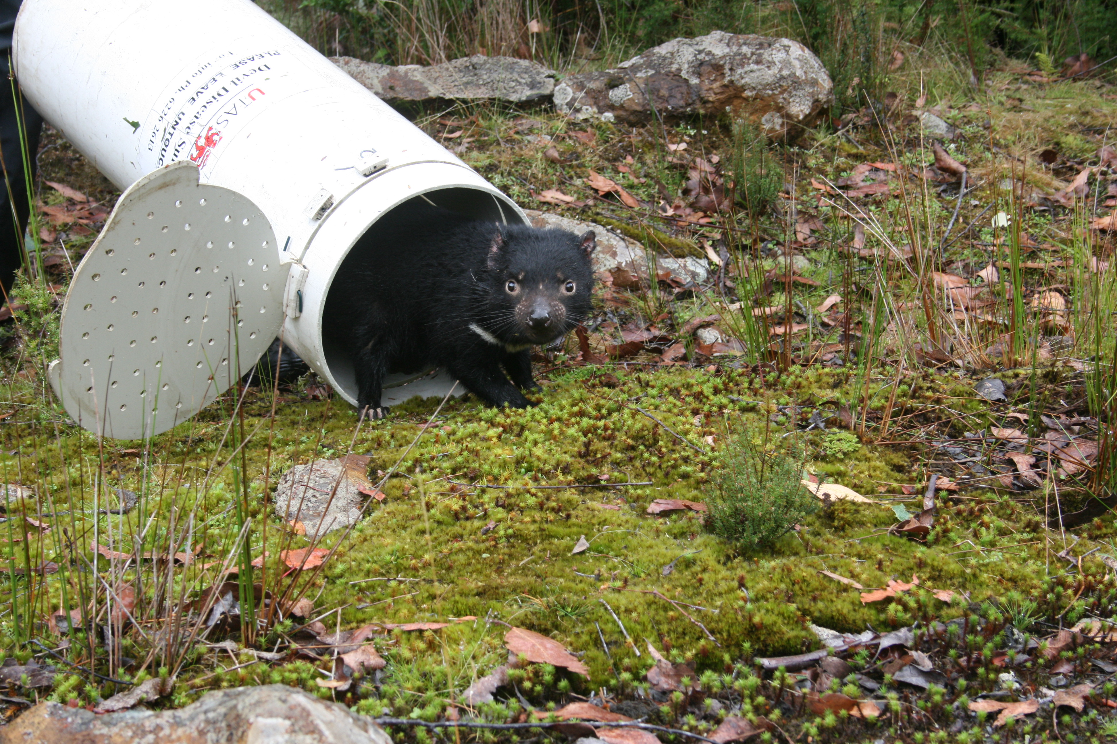 Devil released from trap Previous Next Published February 22, 2015 at 3888 × 2592 in Gallery Devil populations dynamics have been monitored by mark-recapture conducted by University of Tasmania researchers Rodrigo Hamede and and Menna Jones for decades.