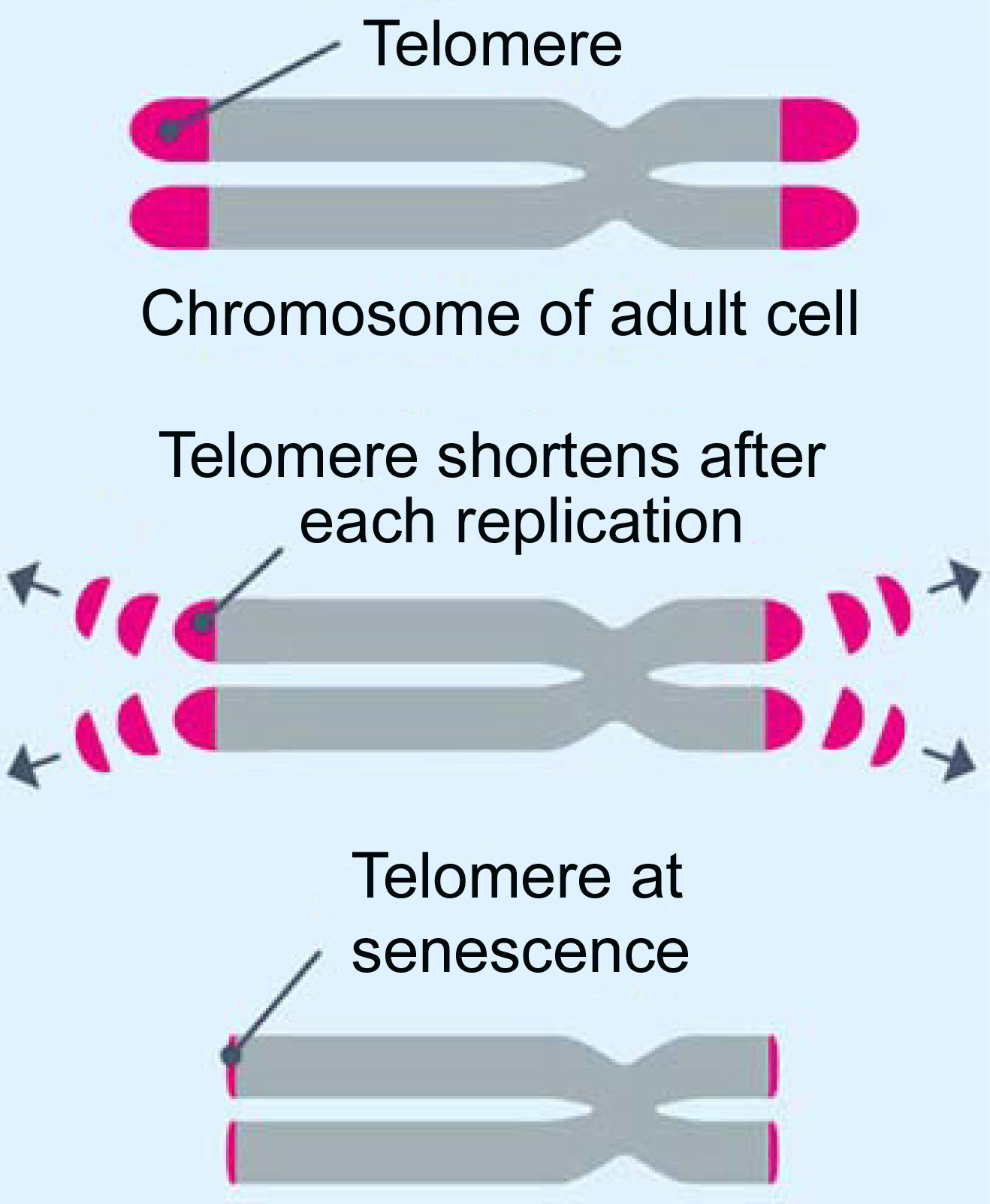 Telomeres are long repetitive noncoding sequences of DNA located at the ends of chromosomes. Telomeres have been compared to the protective plastic on the end of a shoelace and in the same way as the plastic protects the shoelace from fraying. The primary role of the telomeres is to protect the end of the chromosomes from โfrayingโ. During normal cell division telomere length shortens until a critical length is reached, at which point the cell can no longer divide and is subjected to apoptosis. Environmental factors such as increased stress, oxidative damages and pathogens have been shown to have a significant impact on organismal telomere dynamic.